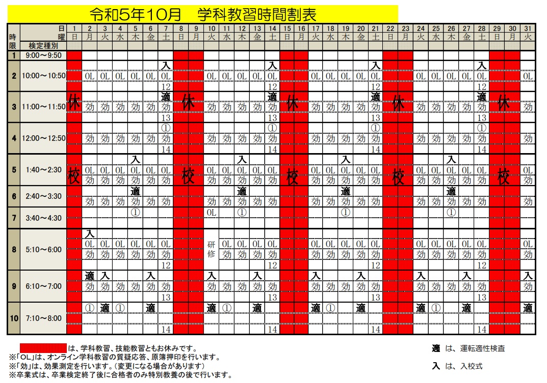 令和5年10月 学科時間割表