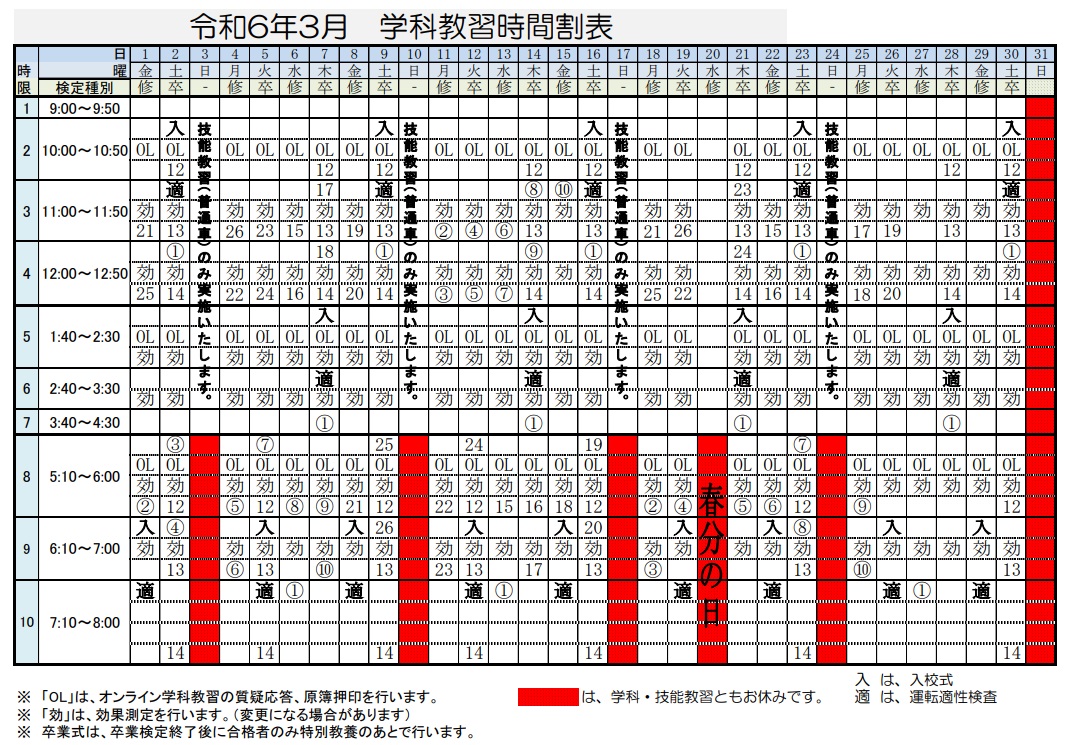 令和6年3月 学科時間割表