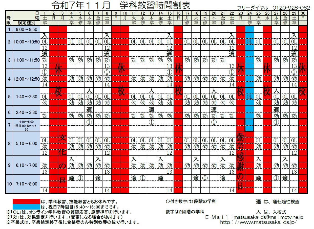 令和7年11月 学科時間割表